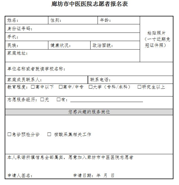 廊坊市中醫(yī)醫(yī)院志愿者報名表